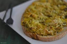 Ingrédients: pain a bruschetta, crème fraiche, oignon, champignon de paris, chèvre, emmental rapé